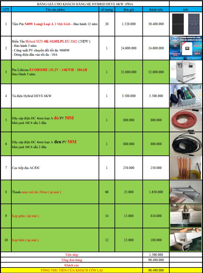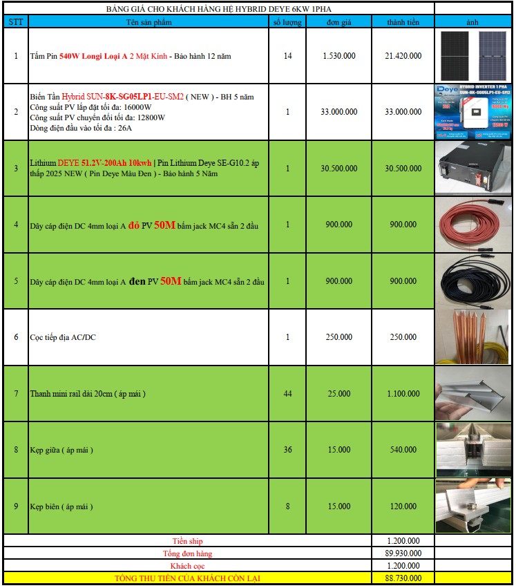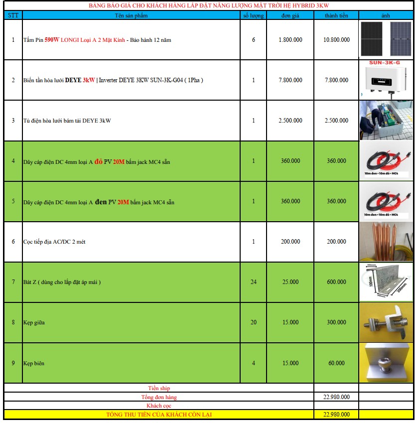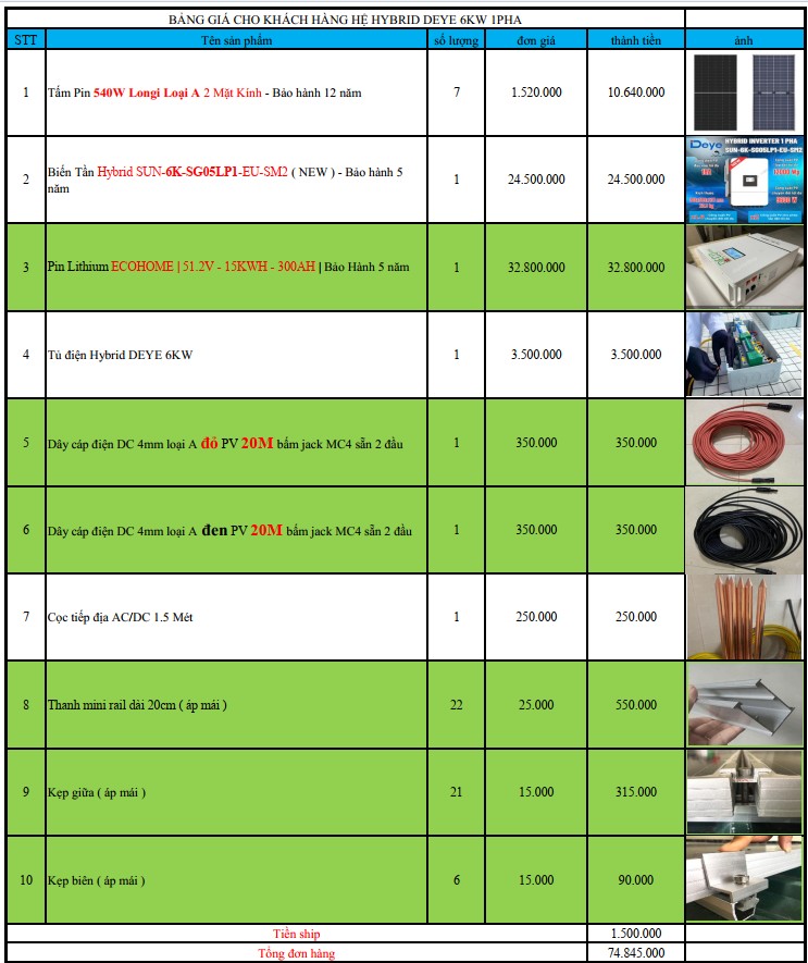 | Combo 1 | 3kWp (6 tấm pin 550W + inverter 3kW) | Nhà phố, hộ gia đình nhỏ | Hòa lưới hoặc hybrid |
