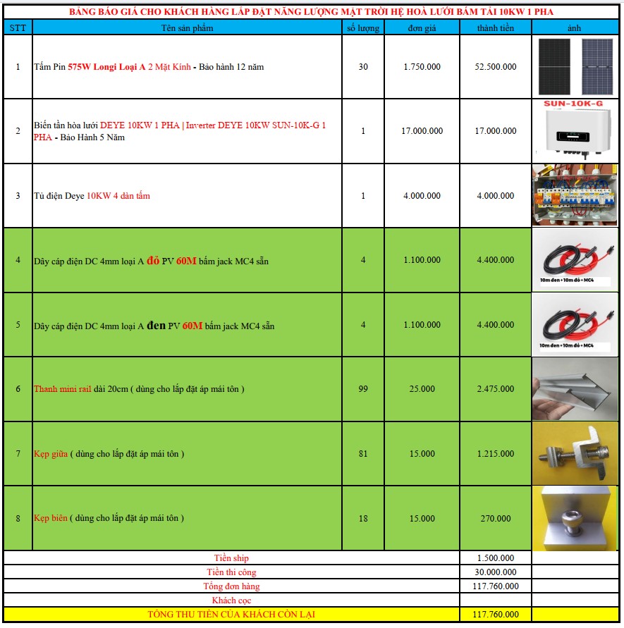 | Combo 3 | 10kWp (18 tấm pin 550W + inverter 10kW) | Biệt thự, doanh nghiệp vừa | Có thể nâng cấp thêm pin 10kWh |