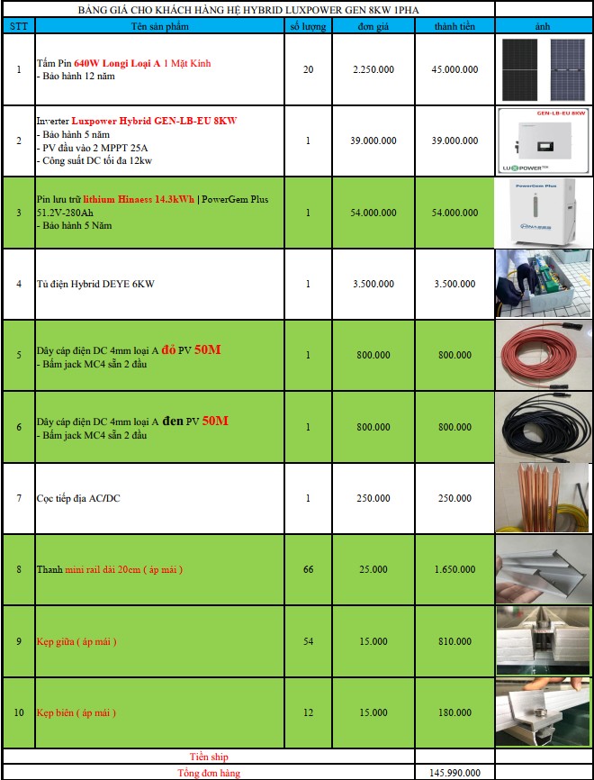 Combo 3 10kWp (18 tấm pin 550W + inverter 10kW) Biệt thự, doanh nghiệp vừa Có thể nâng cấp thêm pin 10kWh