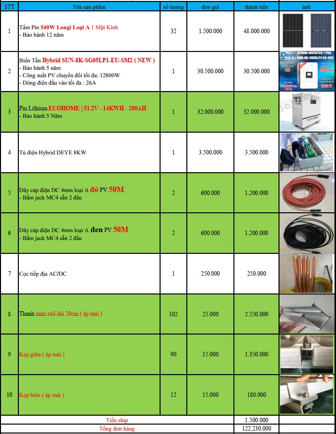 Combo 3 10kWp (18 tấm pin 550W + inverter 10kW) Biệt thự, doanh nghiệp vừa Có thể nâng cấp thêm pin 10kWh