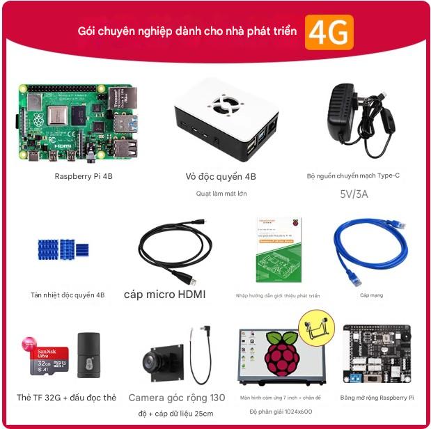 Các hình ảnh mô tả các gói kit khác nhau (Ví dụ: "Gói nâng cao camera 8G," "Gói phát triển chuyên nghiệp 8G") bao gồm các thành phần sau: