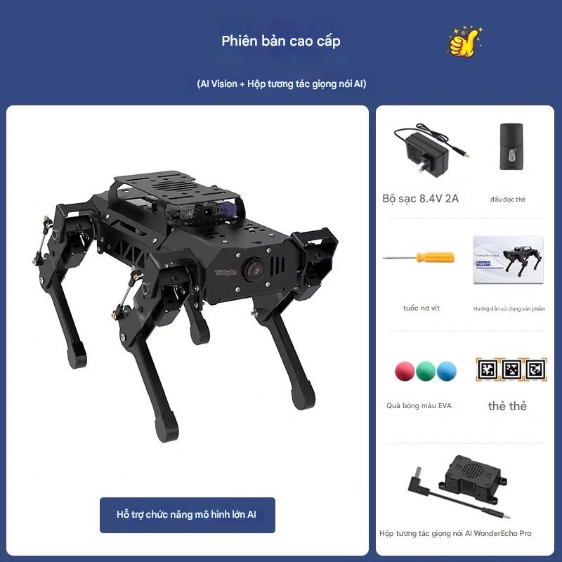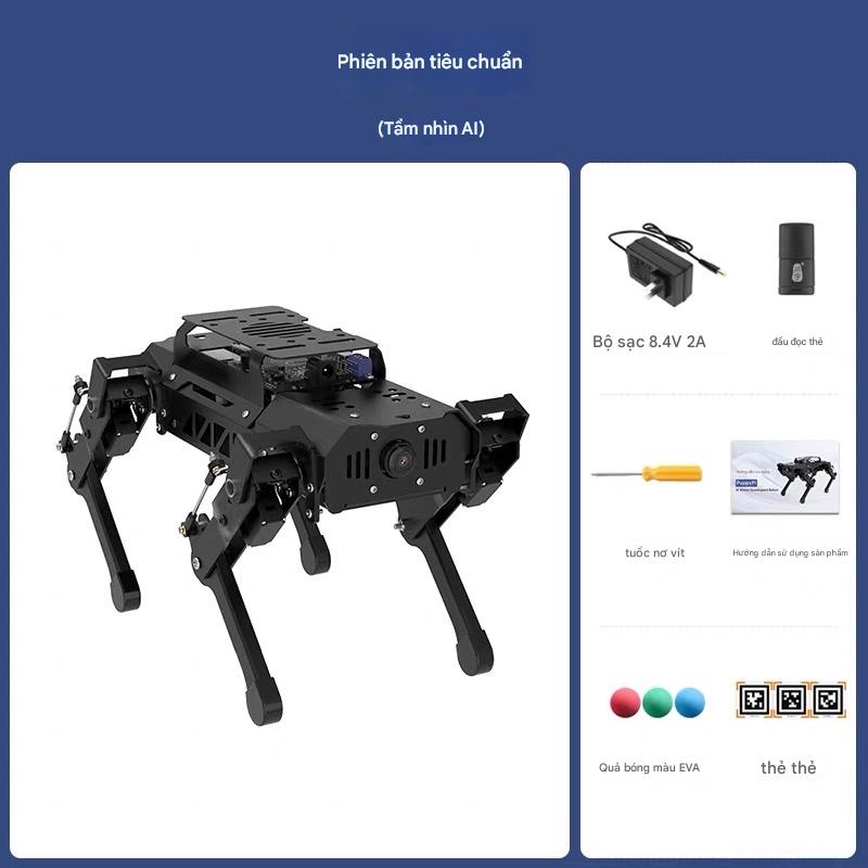 Robot chó cơ khí Huaner là mô hình nghiên cứu và phát triển AI bionic cao cấp, được thiết kế mô phỏng hoạt động của động vật bốn chân với độ linh hoạt cao. Trang bị bộ xử lý chính Raspberry Pi, camera góc rộng AI Vision, cảm biến đa hướng và hệ thống chuyển động chính xác cho phép robot dễ dàng thực hiện các tác vụ tự động, nhận diện đối tượng, theo dõi, giao tiếp giọng nói, lập bản đồ và điều hướng môi trường.