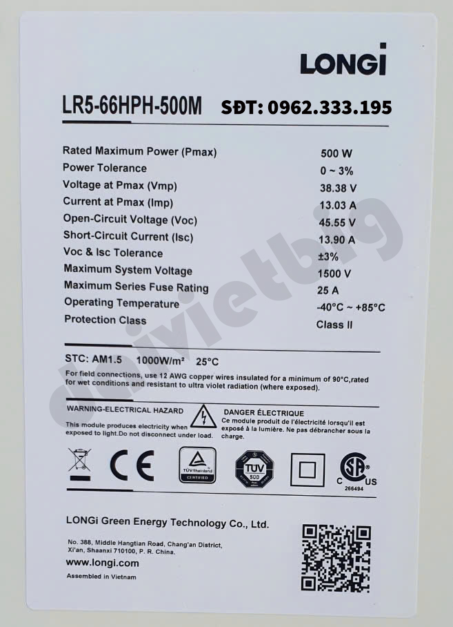 | Điện áp hở mạch (Voc) pin mặt trời longi 545W | 45.55 V |