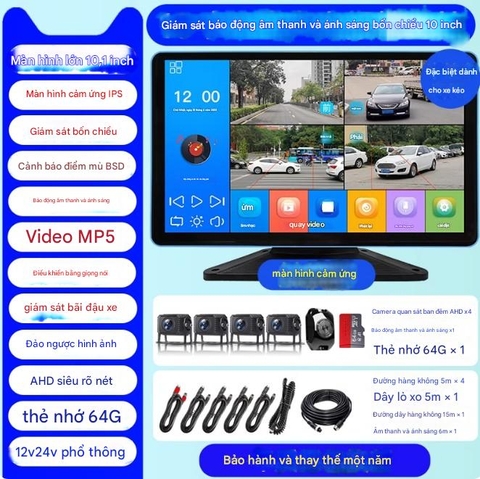 Máy ghi hình lái xe tải 12v, 24v【Bốn hướng】Màn hình cảm ứng 10 inch + cảnh báo điểm mù + báo động bằng âm thanh & ánh sáng + 64G