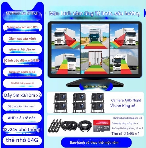 Máy ghi hình lái xe tải 12v, 24v [Sáu hướng] Màn hình cảm ứng siêu nét 10 inch + cảnh báo điểm mù + 64G