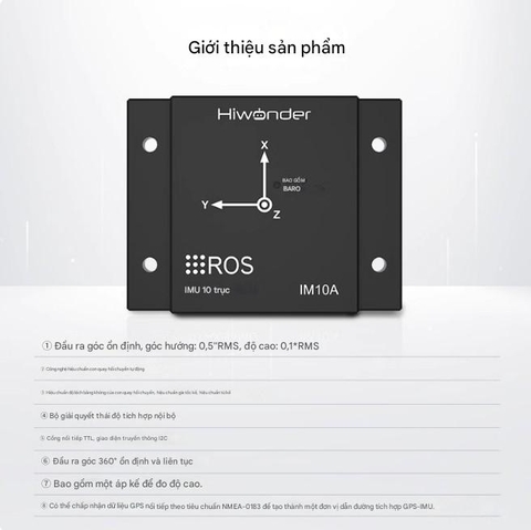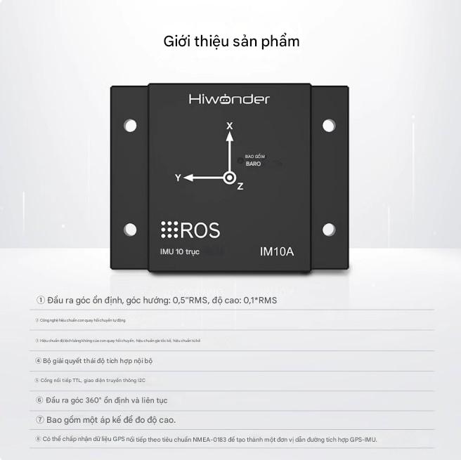 Hỗ trợ ROS1/ROS2: Mô-đun IM10A hoàn toàn tương thích với cả hệ thống ROS1 và ROS2, cung cấp các gói chức năng (functional packages), giao thức dữ liệu C/C++ và hướng dẫn sử dụng, giúp người dùng dễ dàng tích hợp vào môi trường ROS. * Khả năng Tương thích Rộng rãi: Tương thích với các bo mạch chủ và bảng mở rộng phổ biến như Raspberry Pi, Jetson, Arduino, STM32, v.v.