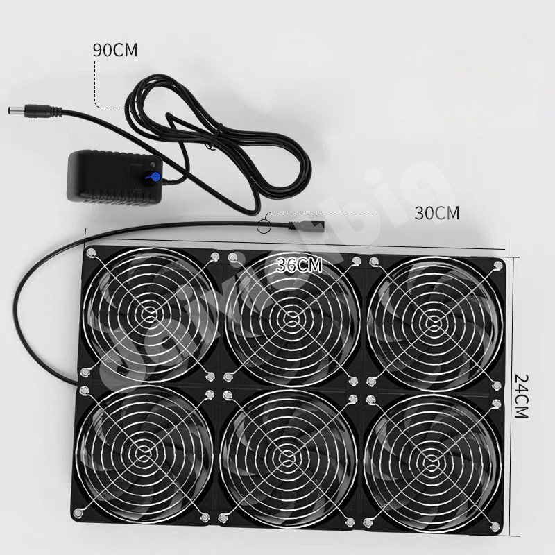 Gồm 6 quạt 12x12cm, bố trí thành hàng ngang 3x2, tổng kích thước 36x24cm