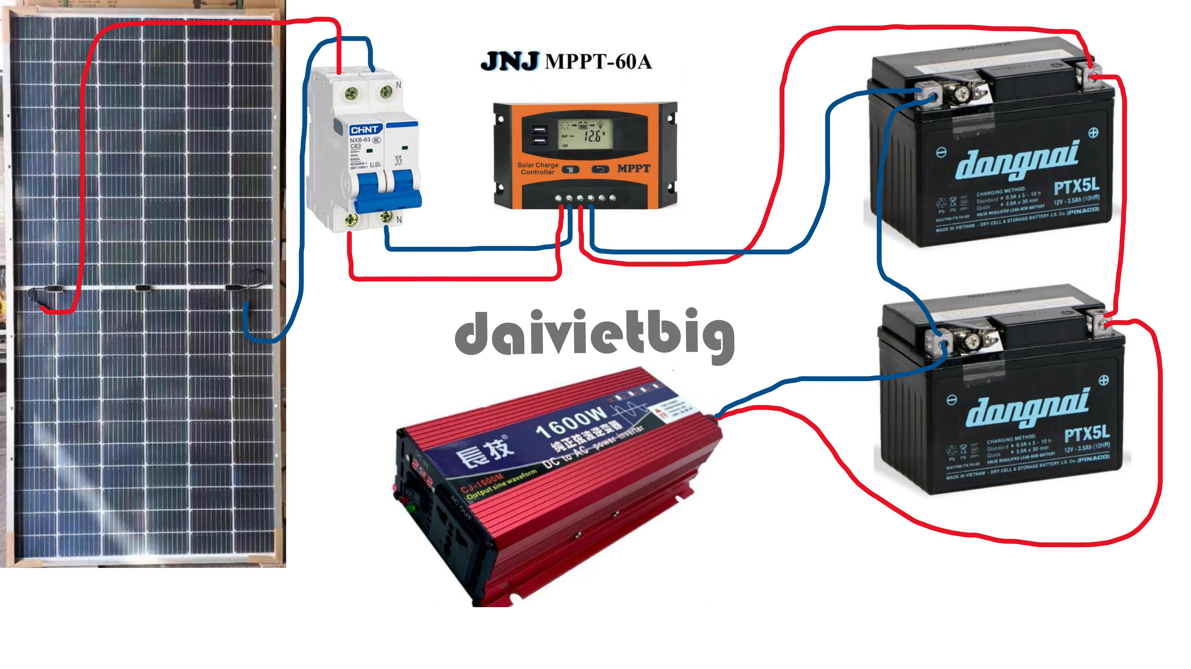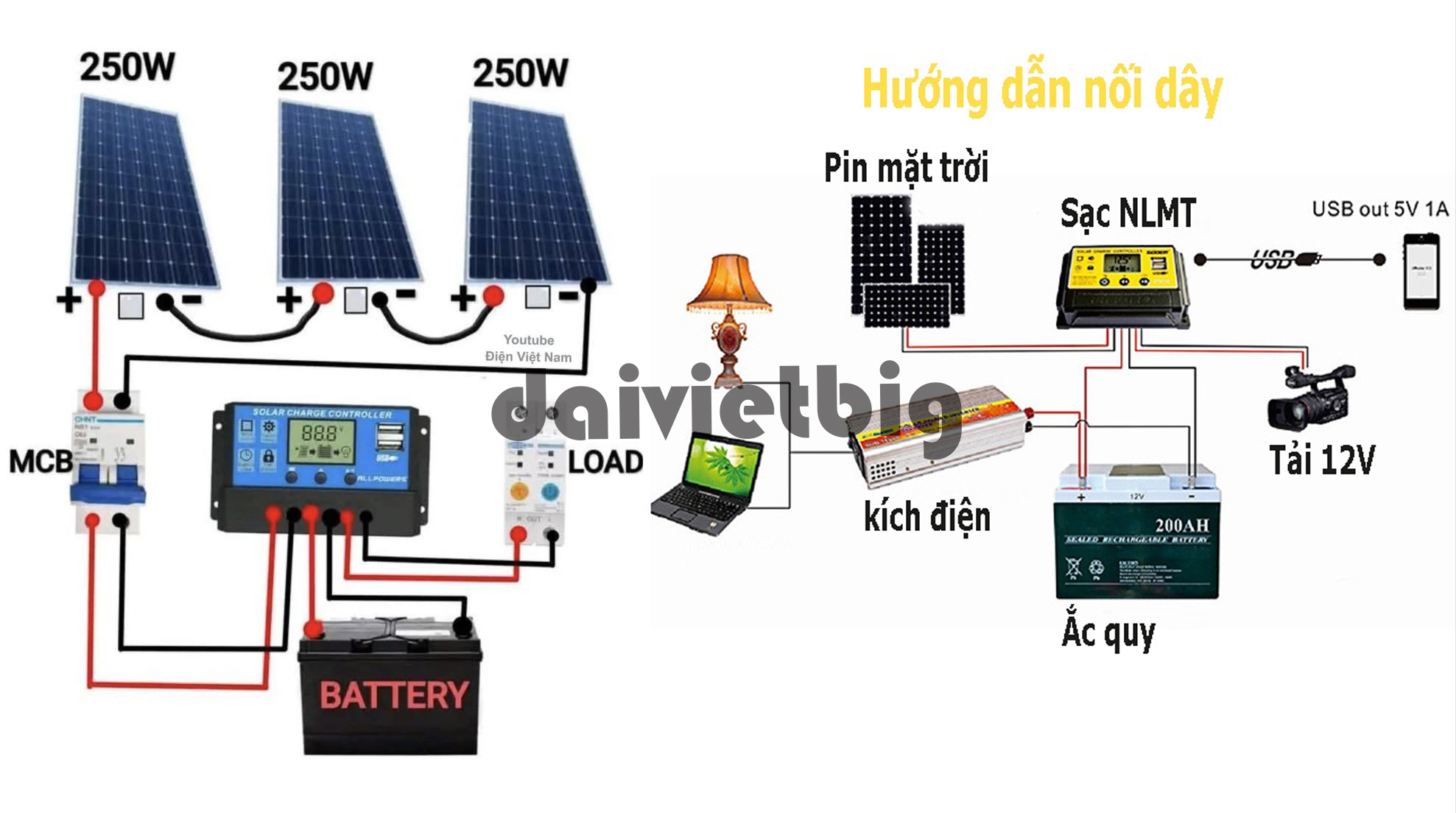 Dây điện DC từ tấm pin đến bộ điều khiển và từ bộ điều khiển đến ắc quy: dùng loại dây đủ tiết diện (4mm², 6mm² trở lên tùy công suất)