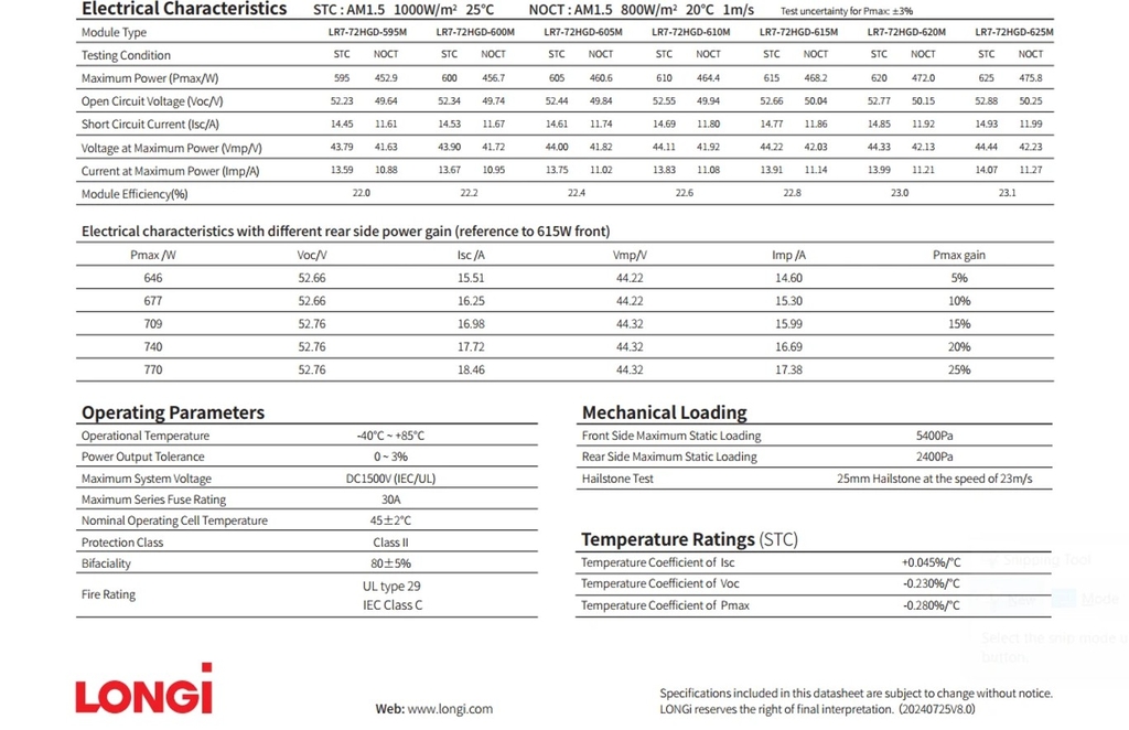 Thông Số Kỹ Thuật Của Tấm Pin Longi Solar 610W Himo X7 2 Mặt Kính